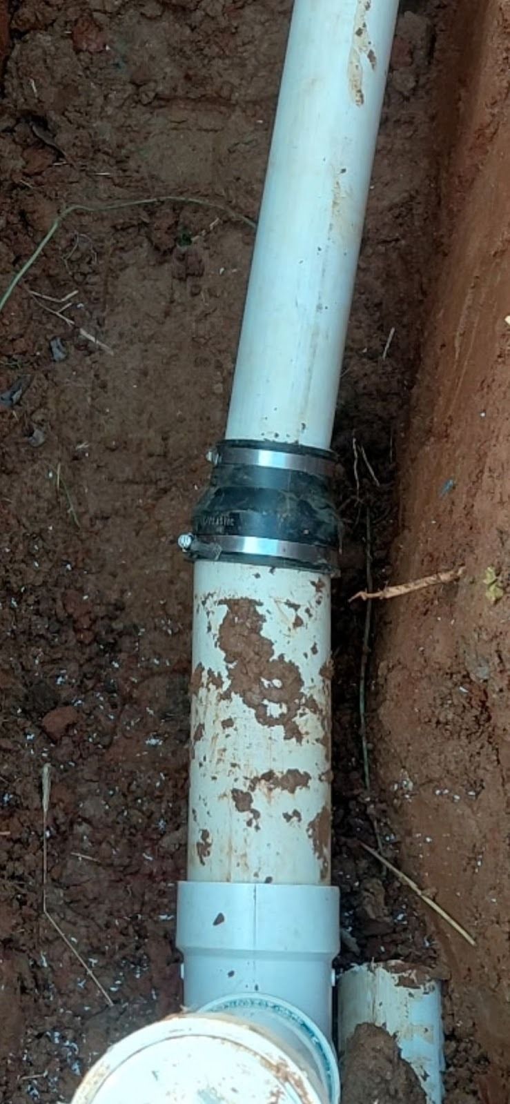 [Photos below showing the 4 inch to 3 inch pipe reduction without proper fittings. All of it is getting redone.]